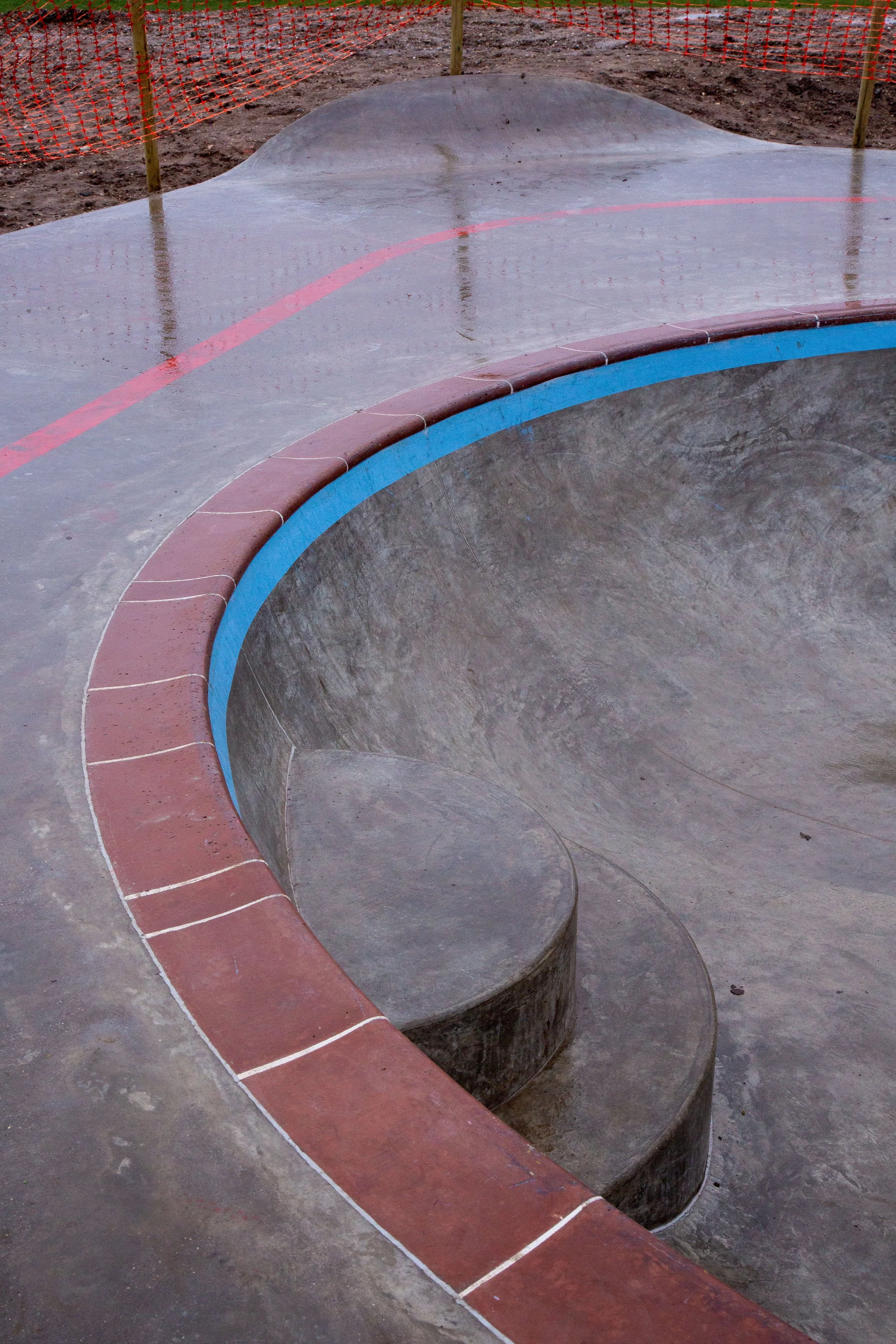 The project features bespoke terracotta pool coping by CLINKER, alongside custom pool steps and a deathbox feature, all inspired and referencing the origins of skateboarding in drained Californian swimming pools. The site also includes a purpose-built shelter with integrated concrete seating, providing a comfortable space for visitors to rest and socialise.