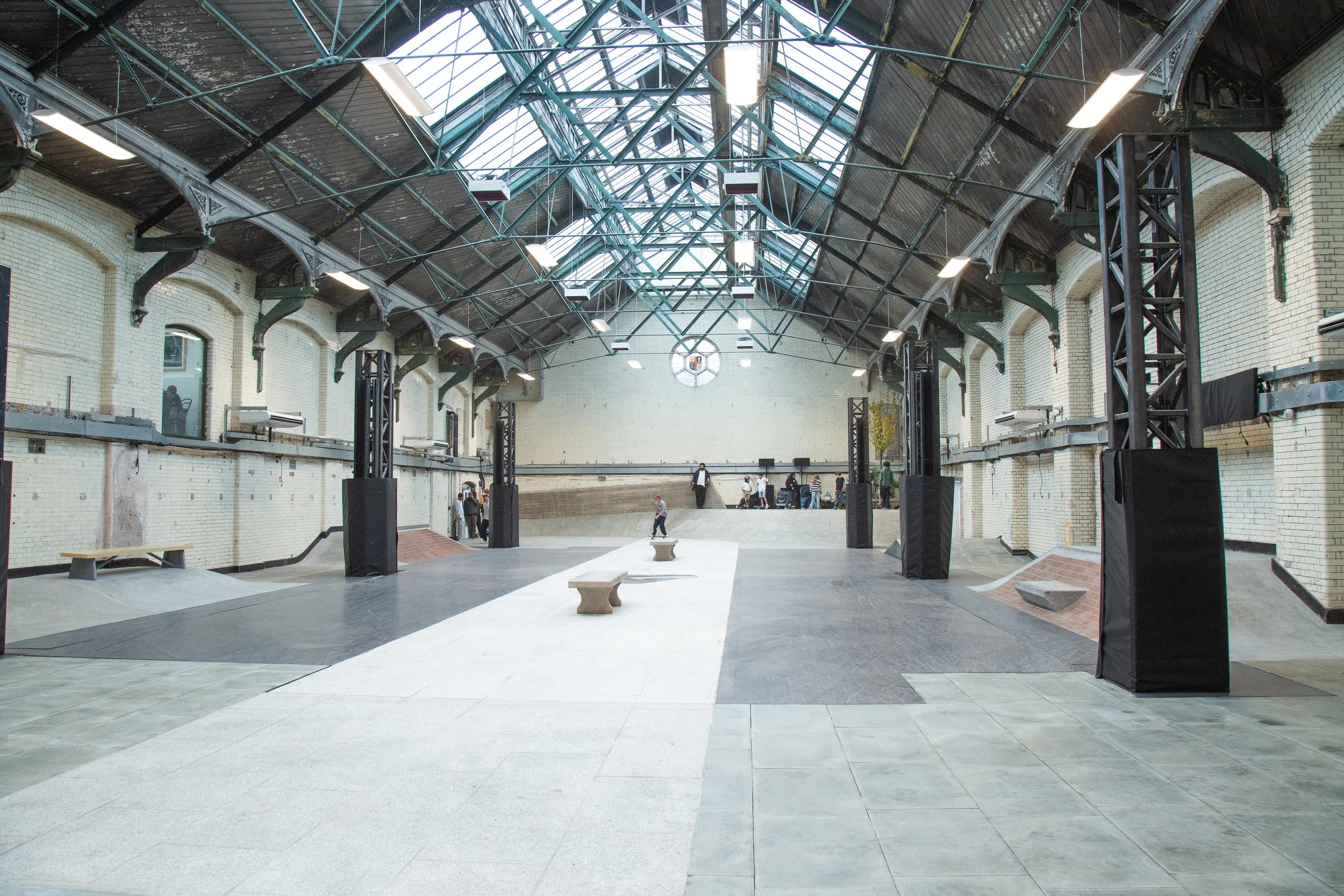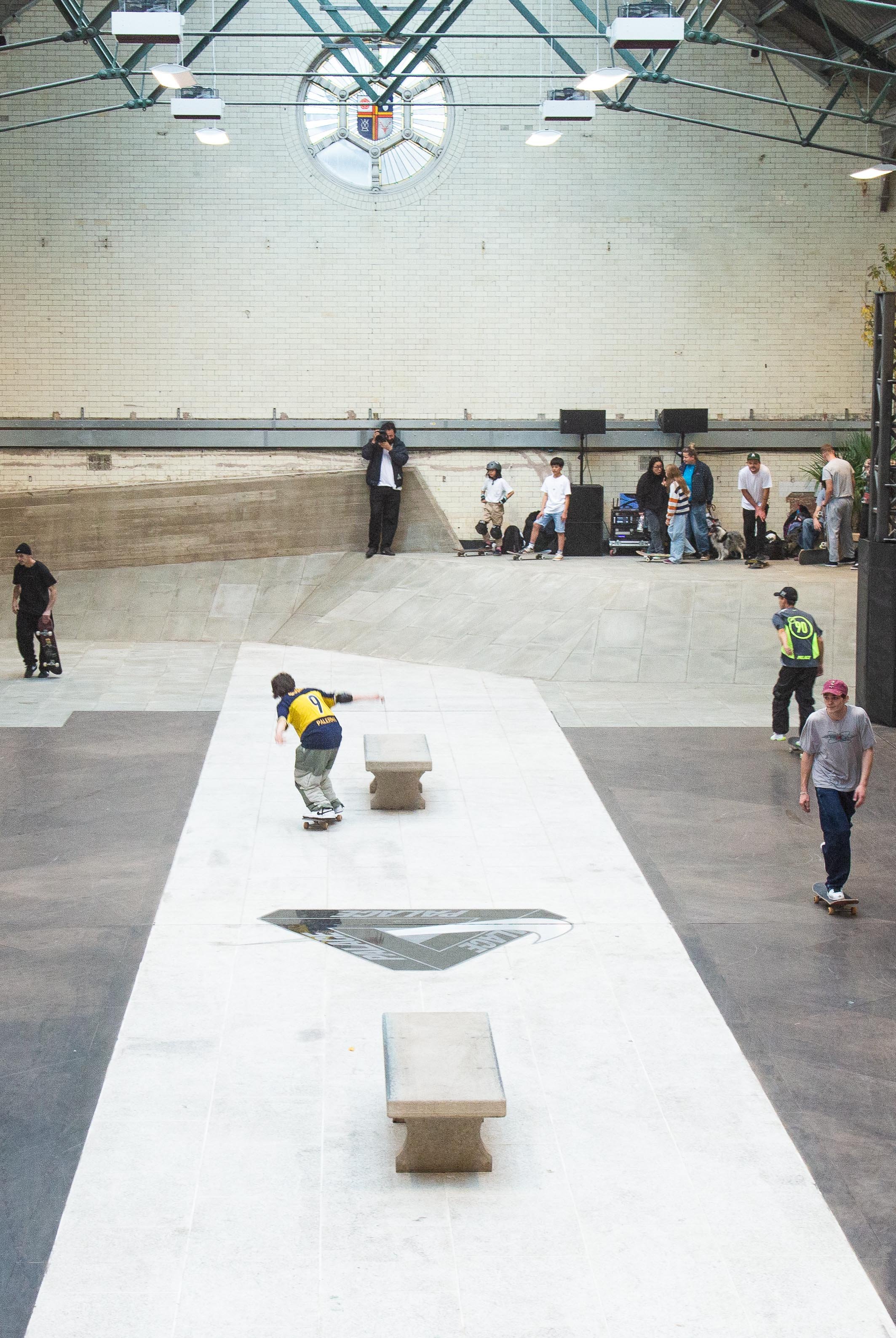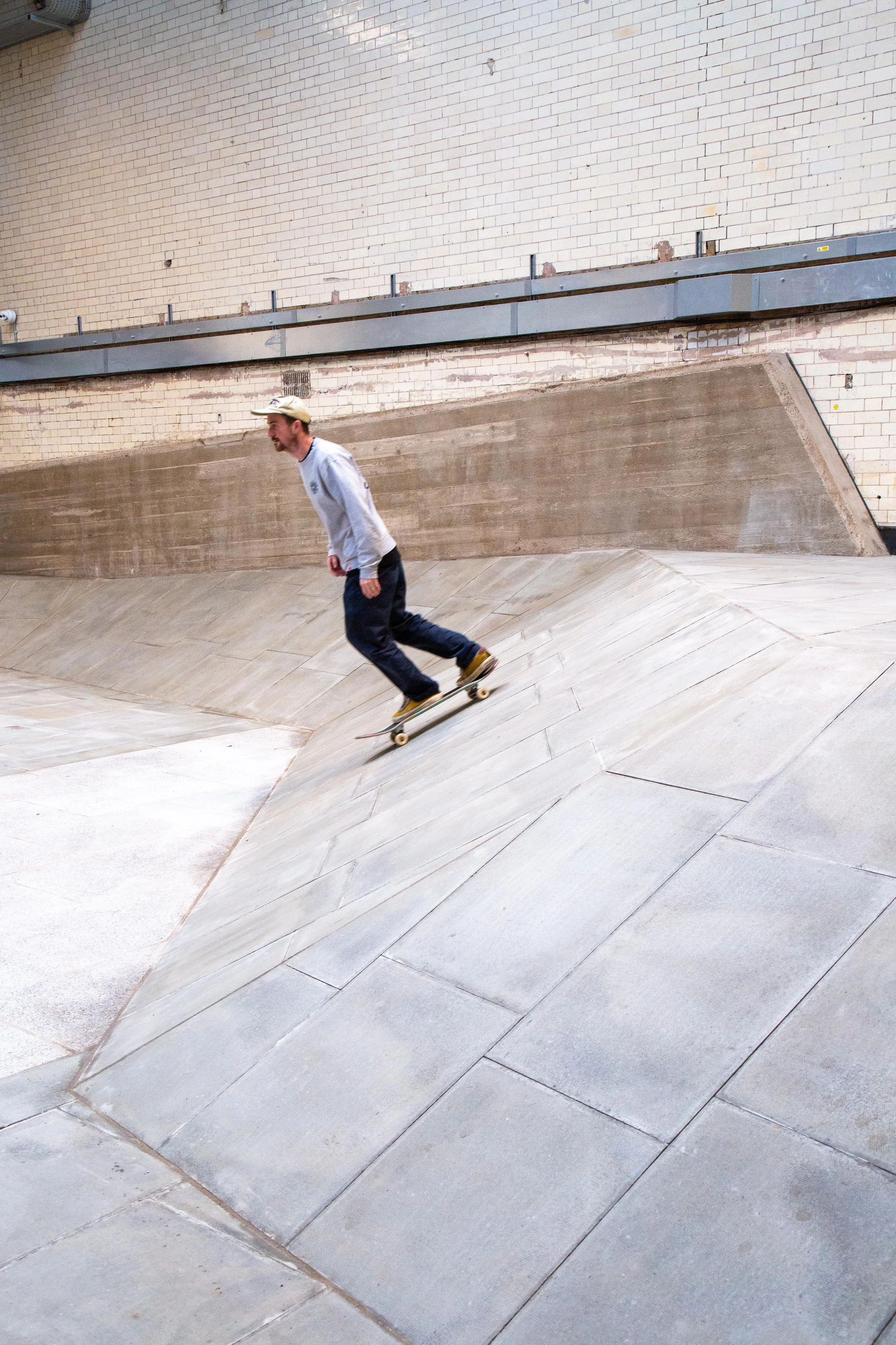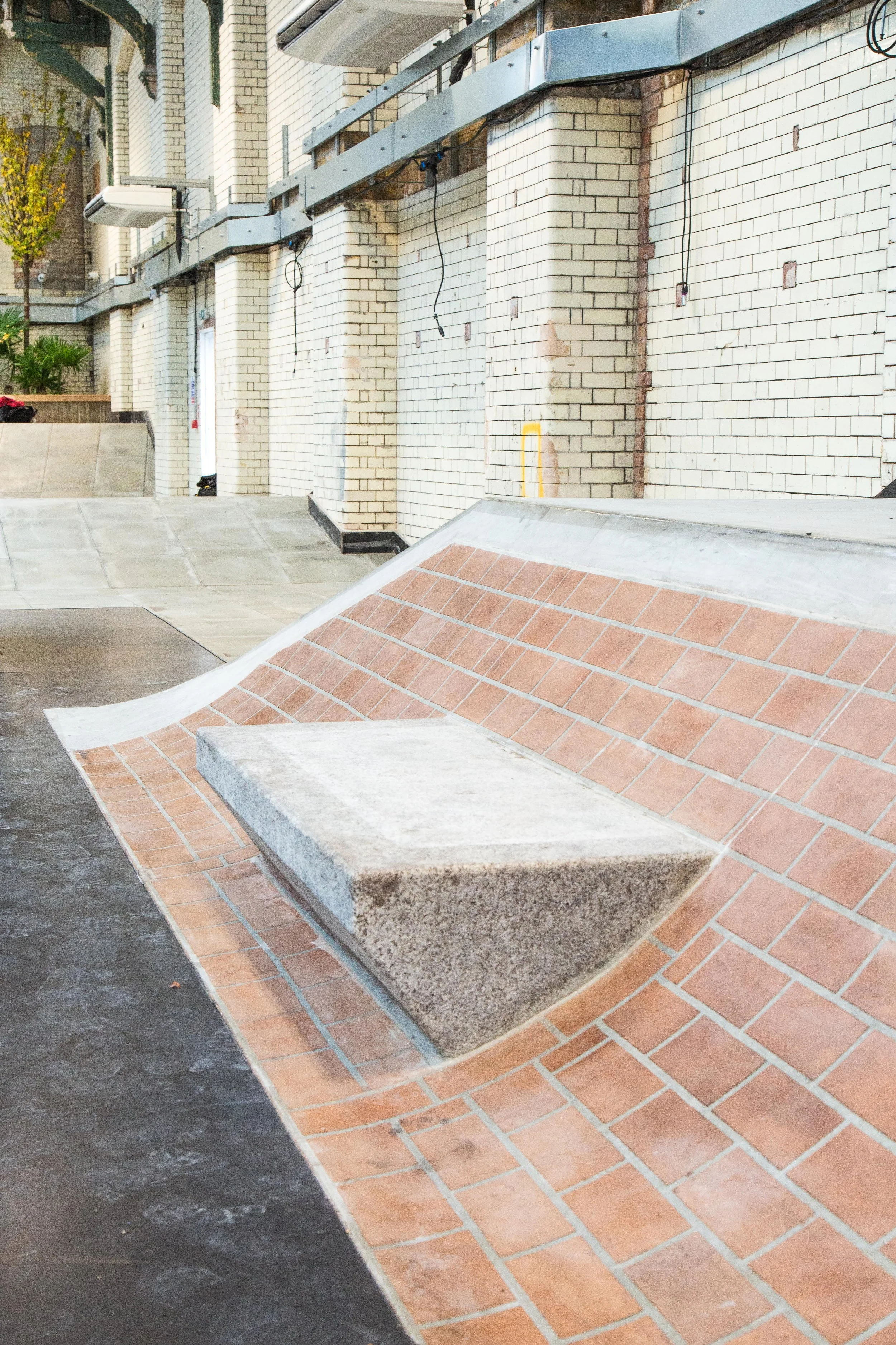 A granite-paved strip runs through the centre of the space, anchoring salvaged and restored Victoria Benches, with stained plywood flooring defining the surrounding skateable areas. Together, these elements establish a clear material language, and create multiple lines throughout the space.