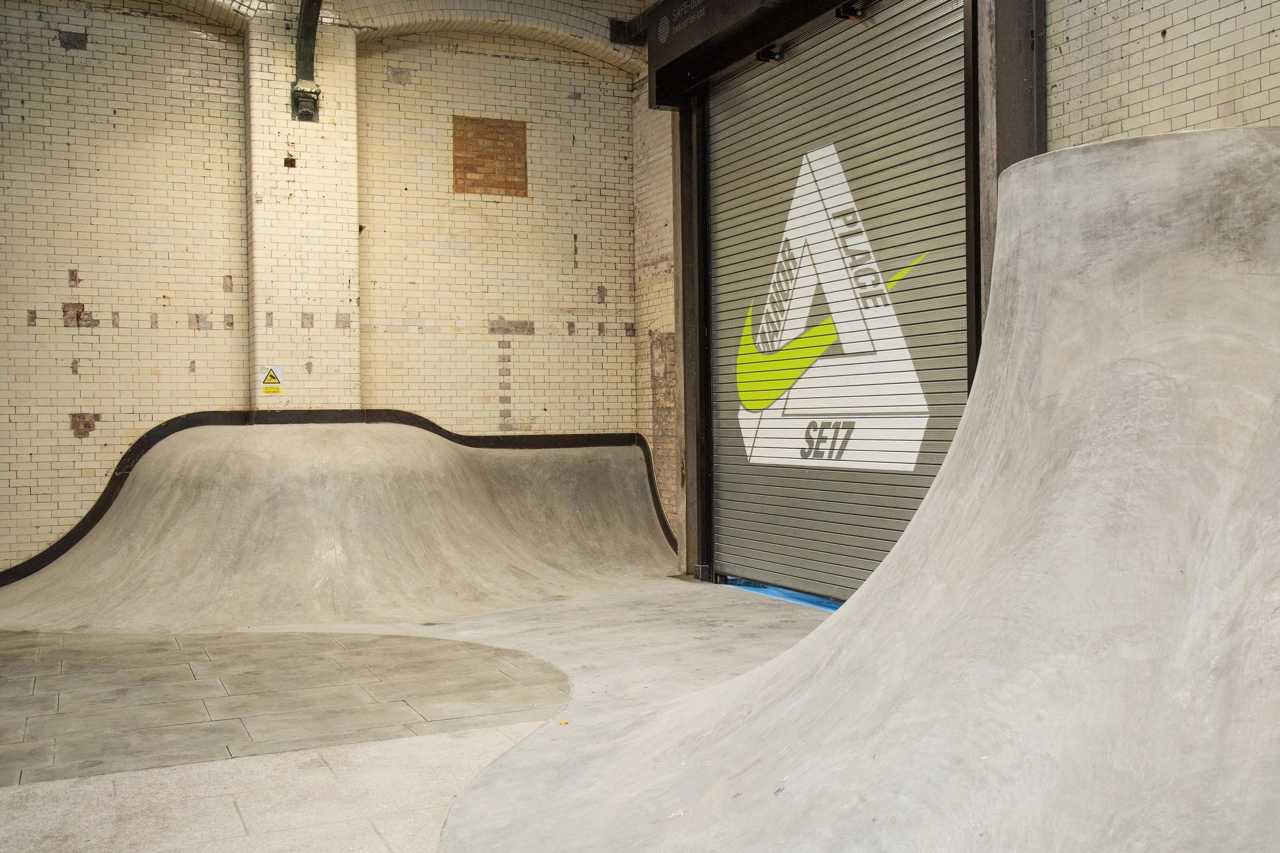 Beneath the skatepark sits a concealed, mechanical 3-on-3 football pitch created by Stage Services. The intervention retains the scale and atmosphere of the original baths while introducing a new public function. Manor Place provides a significant free-to-use covered facility for London’s skateboarding and football communities, offering one of the largest spaces of its kind in the city.